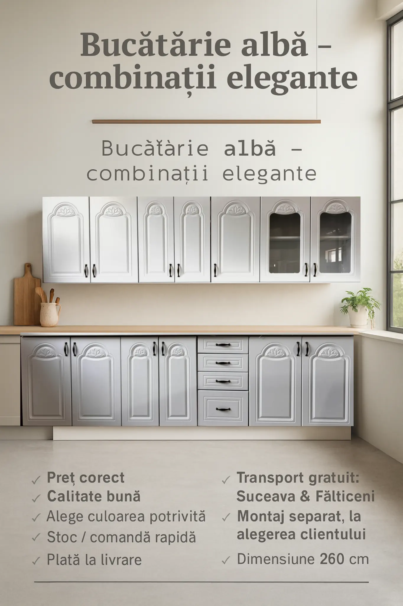 Cauți bucătării Suceava pe care să le poți lua imediat? Spațiul tău, gustul tău — noi doar îl facem real. Avem serii pe stoc, cu preț bun pentru calitatea oferită: alegi rapid, ridici în aceeași zi sau primești livrare gratuită în Suceava & Fălticeni.